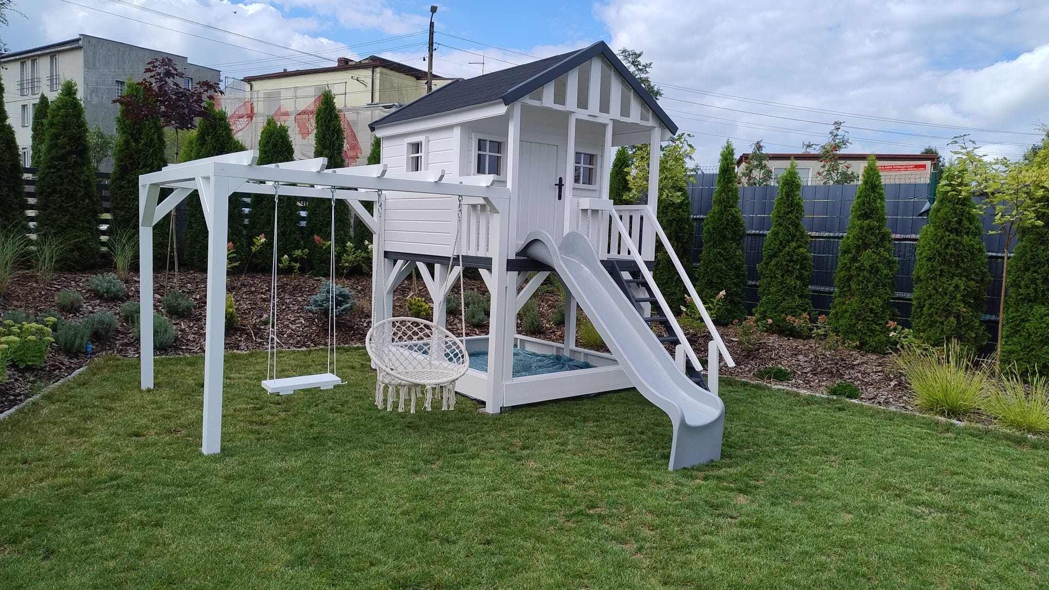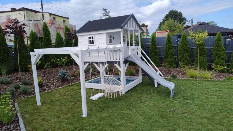 Przedstawiamy domek z białego drewna, wyposażony w szaroniebieską zjeżdżalnię, urokliwą huśtawkę i miejsce na piaskownicę.