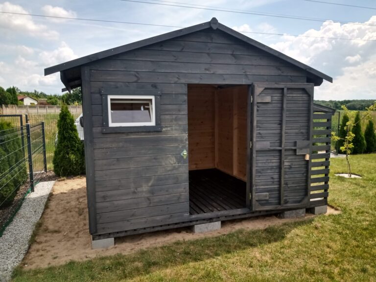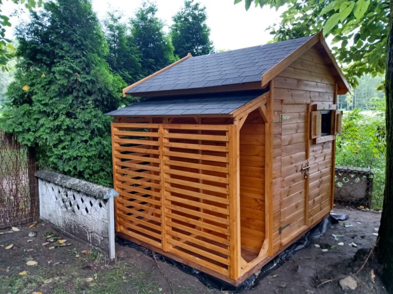 Domek narzędziowy ze zdjęcia o wymiarach 3x3m. Drewno Skandynawskie c-24, suszone, kanty zaokrąglone, bez drzazg.