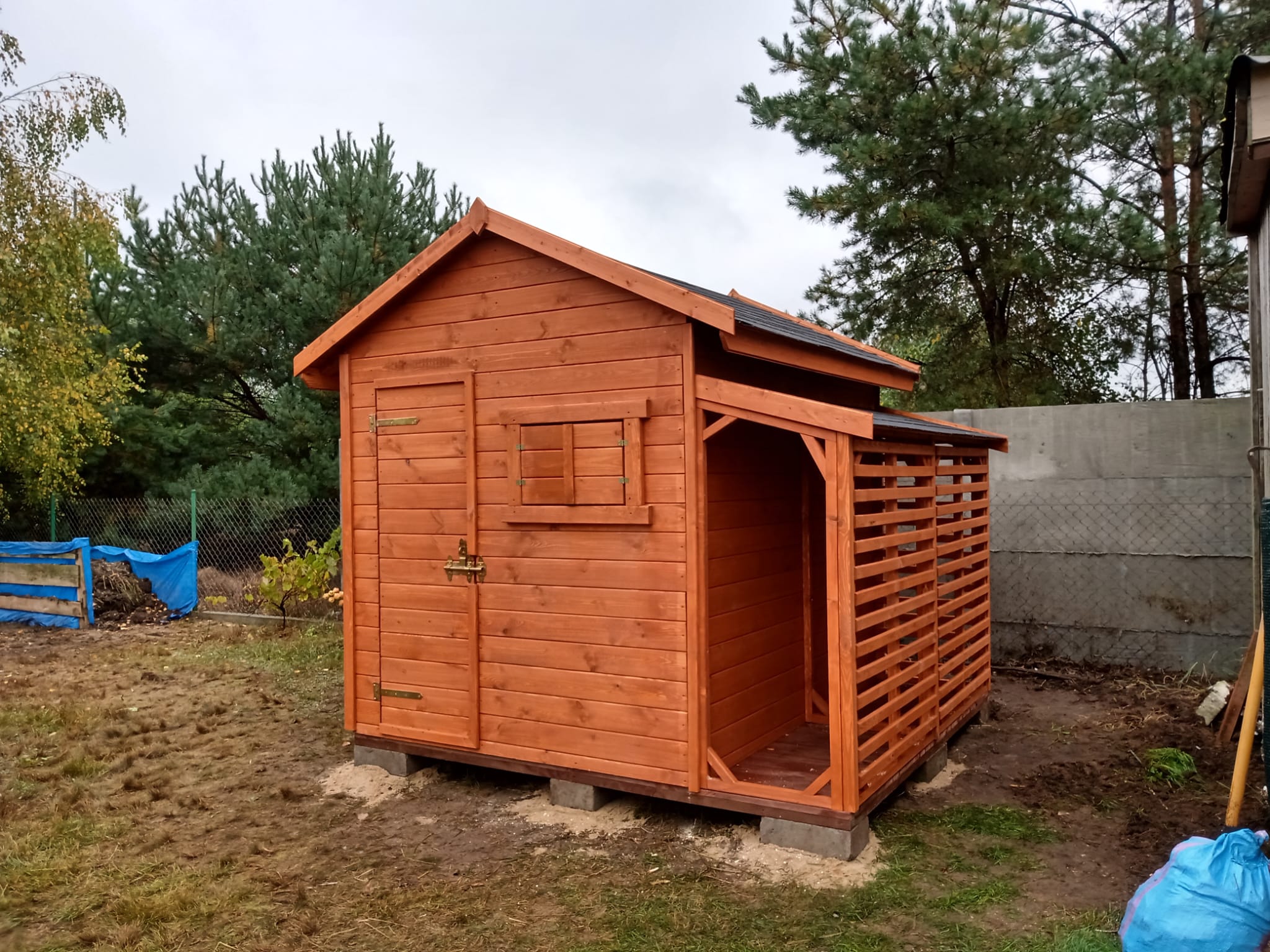 – drewutnia z boku domku 300×0,60 cm , z dachem jednospadowym i jednym wejściem
